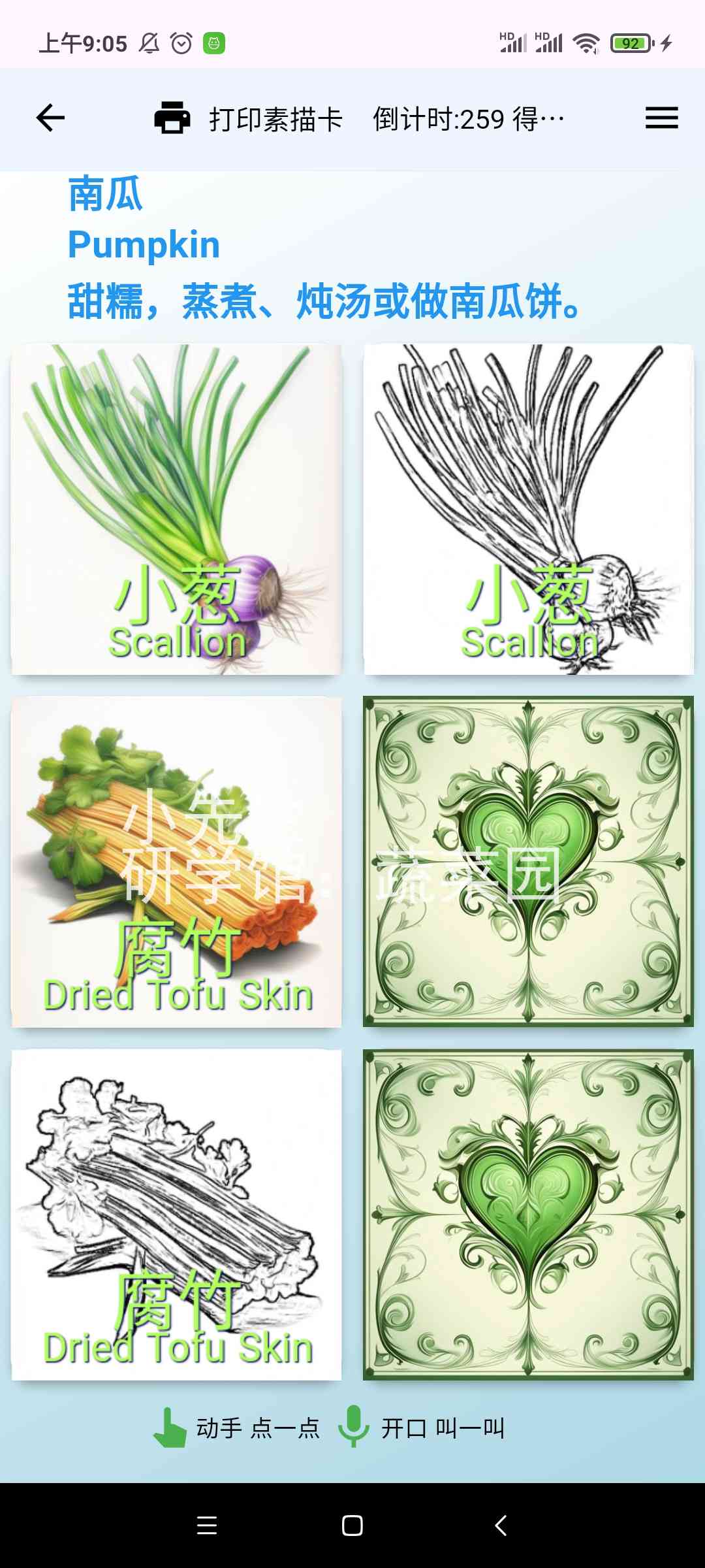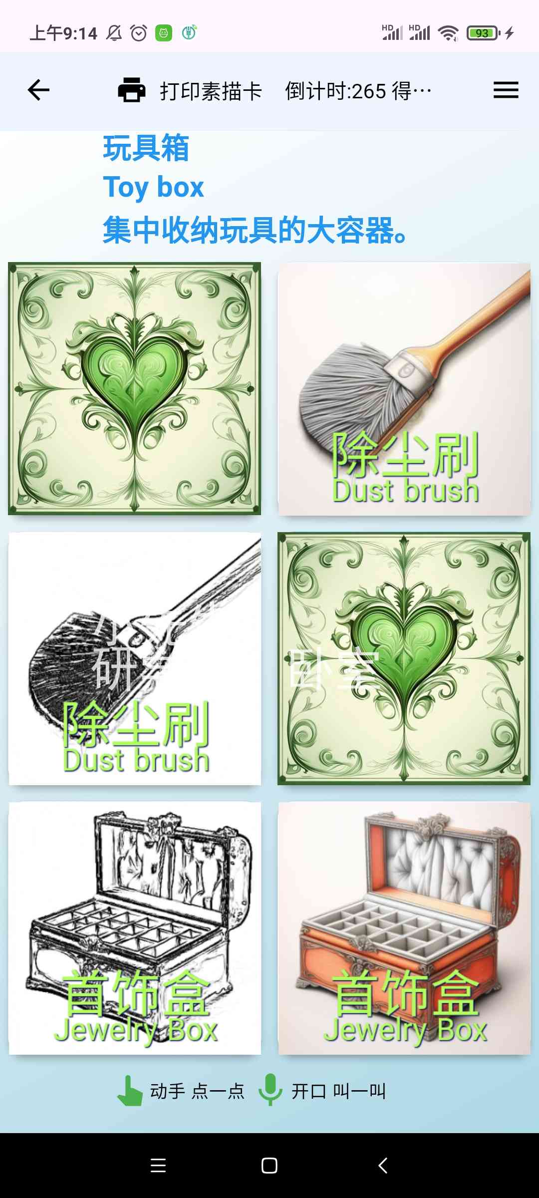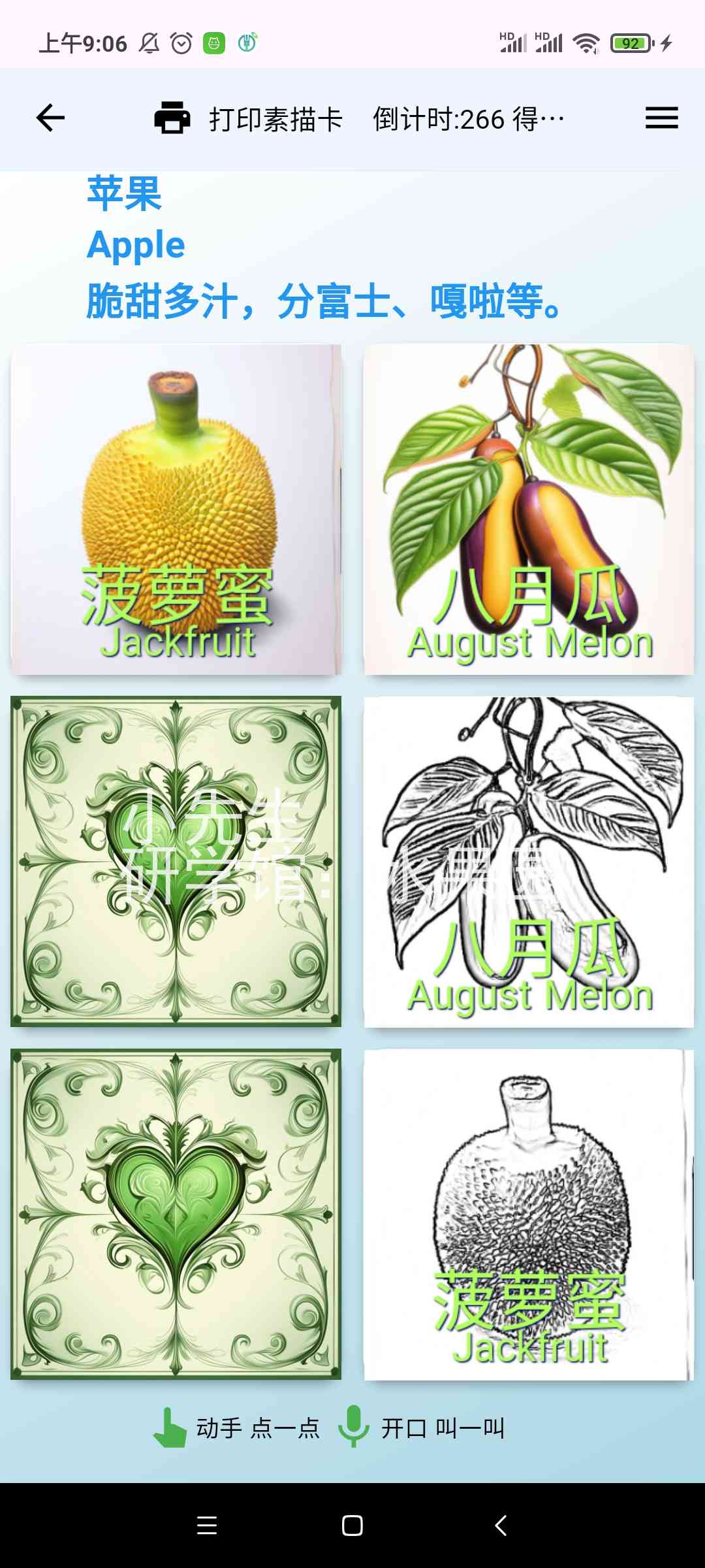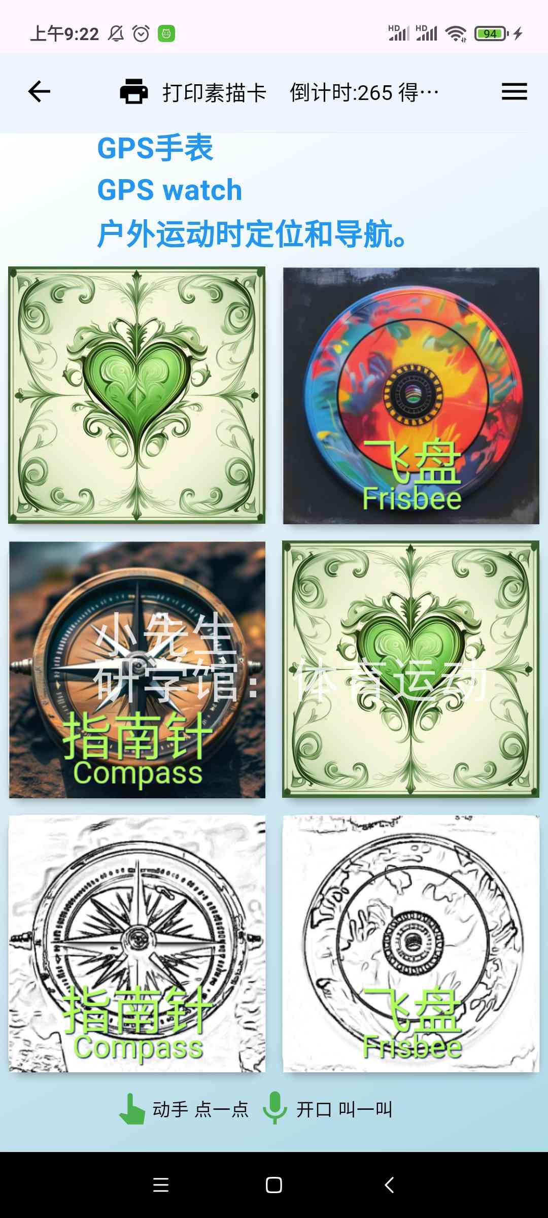 描红打印输出[需另买热敏票据打印机],或市面一些识字卡片,用手机摄像头照一照,玩一玩,学一学。